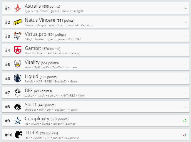 В первой десятке произошли два изменения — Complexity Gaming прибавила два пункта и заняла девятое место, а FURIA Esports остановилась на десятом. G2 Esports покинула топ-10. Heroic обошла Evil Geniuses, а FaZe Clan сместила OG с 17-й позиции.