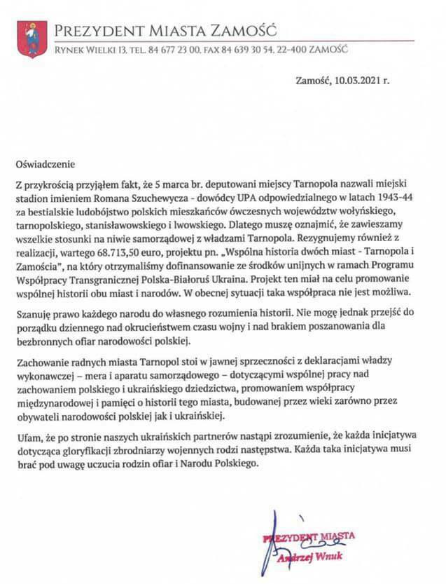 Замосць приостанавливает все отношения в сфере местного самоуправления с властью Тернополя. Кроме того, польско-украинский проект под названием «Общая история двух городов – Тернополь и Замосць» реализован не будет.