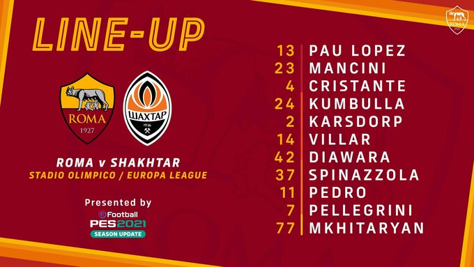 «Рома»: Пау Лопес, Манчини, Камбула, Кристанте, Спинаццола, Вильяр, Диавара, Карсдорп, Пеллегрини, Педро, Мхитарян.