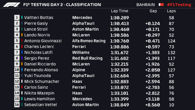А лучшее время дня показал Валттери Боттас. Вторая часть дня получилась для Мерседеса более продуктивной. А по количеству кругов самыми активными были Николас Латифи и Фернандо Алонсо.