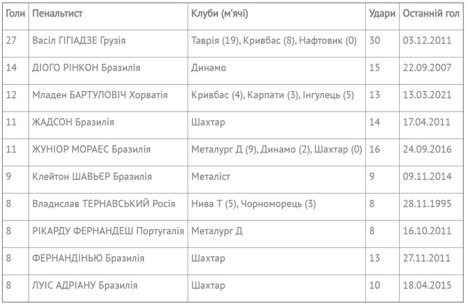 Легионеры, которые чаще всего забивали голы с отметки в Чемпионатах Украины (1992 - 15.03.2020)