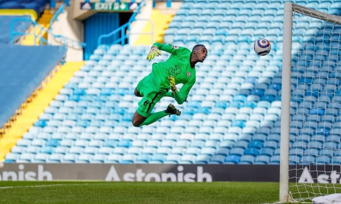 Голкипер «Челси» Эдуар Менди в высоком прыжке чиркнул мяч и наблюдал, как тот врезается в перекладину после удара Тайлера Робертса.