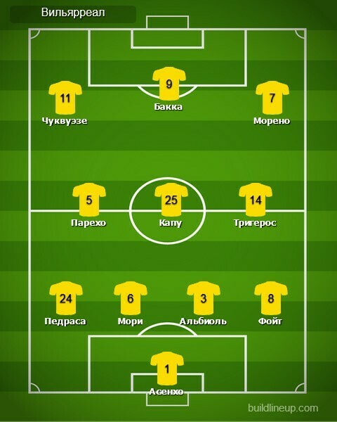 «Вильярреал»: Асенхо, Фойт (Гаспар, 63), Альбиоль, Мори, Педраса, Тригерос (Хауме Коста, 79), Капу, Парехо, Чуквуэзе (Баэна, 71), Бакка (Пино, 63), Морено (Раба, 79).