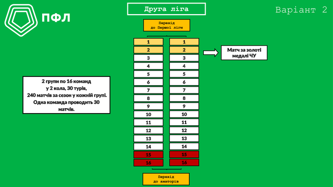 Вторую лигу дополнят молодежные команды клубов УПЛ, и она будет состоять из двух групп, но не более 16 команд в каждой. Аттестацию на получение профессионального статуса проходят 15 клубов. Принятые решение должны быть утверждены Исполкомом УАФ.