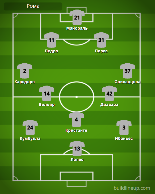 «Рома»: Лопес – Кумбулла, Кристанте, Ибаньес (Манчини, 46) – Спинаццола (Калафьори, 59), Диавара (Пеллегрини, 59), Вильяр, Карсдорп (Б. Перес, 59) – Педро (Эль-Шаарави, 75), К. Перес – Майораль.