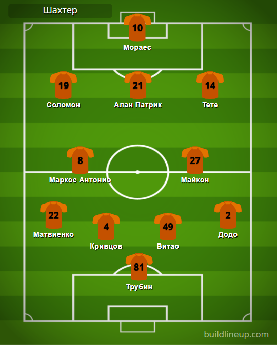 «Шахтер»: Трубин – Матвиенко, Кривцов, Витао, Додо (Болбат, 82) – Маркос Антонио, Майкон – Соломон (Судаков, 77), Алан Патрик (Коноплянка, 60), Тете (Марлос, 60) – Мораес (Дентиньо, 77).