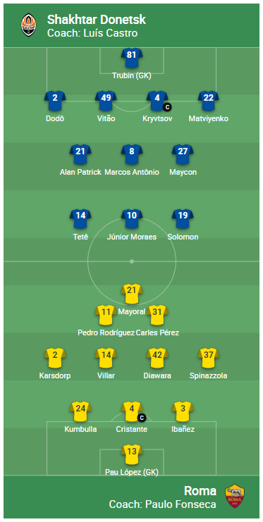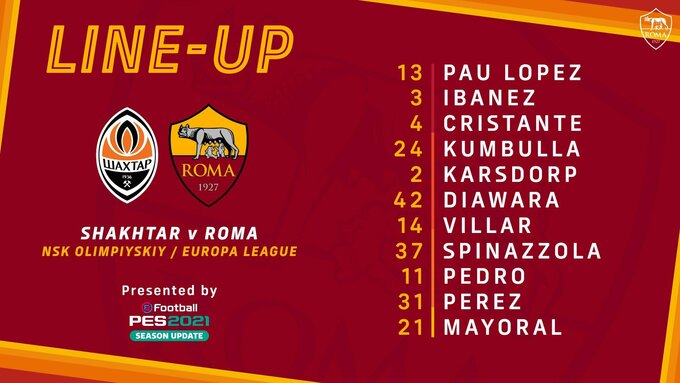 «Рома»: Пау Лопес, Кумбула, Кристанте, Ибаньес, Карсдорп, Вильяр, Диавара, Спинаццола, Педро Родригес, Майораль, Карлес Перес.