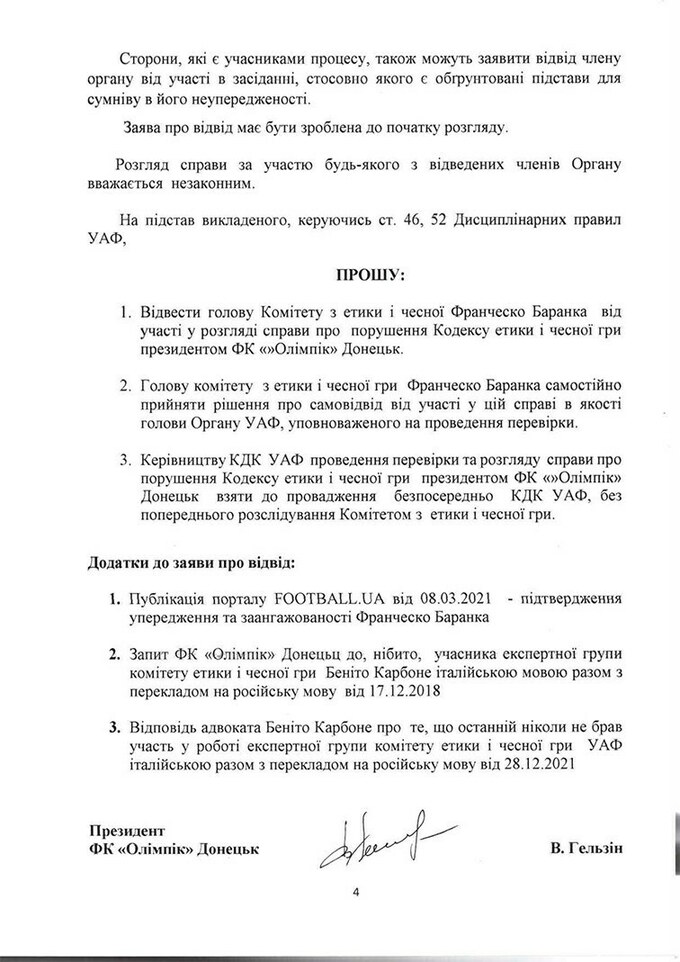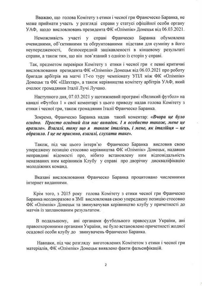 «Ранее Франческо Баранка в СМИ неоднократно демонстрировал свое предвзятое отношение к ФК «Олимпик» Донецк и его руководству, высказывая необоснованные обвинения в махинациях. Согласно ст. 52 Дисциплинарных правил УАФ, отвод члену Органа может быть заявлен, если есть обоснованные основания для сомнений в его непредвзятости. Это касается случаев, если член Органа непосредственно заинтересован в конечном результате дела и связан с одной из сторон».