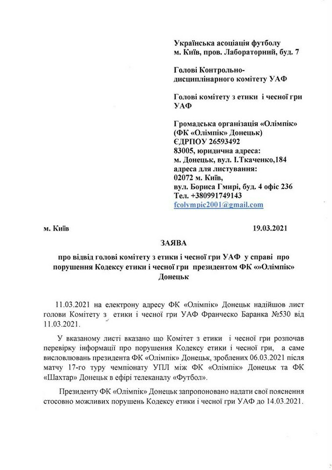 «В связи с указанными обстоятельствами ФК Олимпик Донецк направил в УАФ заявление об отводе главы Комитета этики и честной игры с предоставлением доказательств, подтверждающих его личную заинтересованность и предвзятость», - гласит заявление «Олимпика».