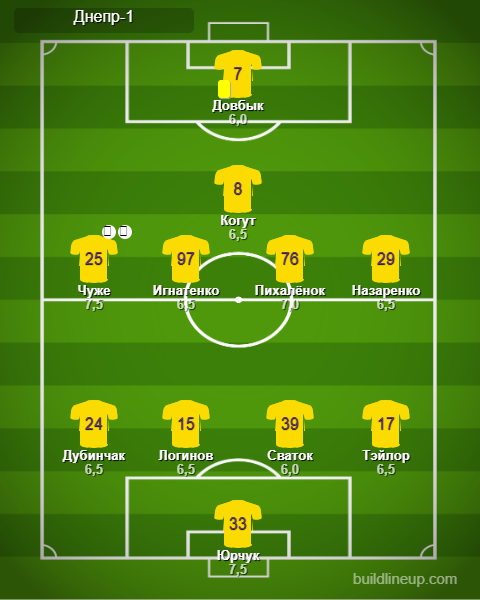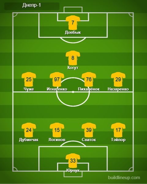 «Днепр-1»: Юрчук, Тэйлор, Сваток, Логинов, Дубинчак, Пихалёнок, Игнатенко, Назаренко (Цуриков, 68), Чуже, Когут (Ди Франко, 78), Довбык (Хобленко, 88).