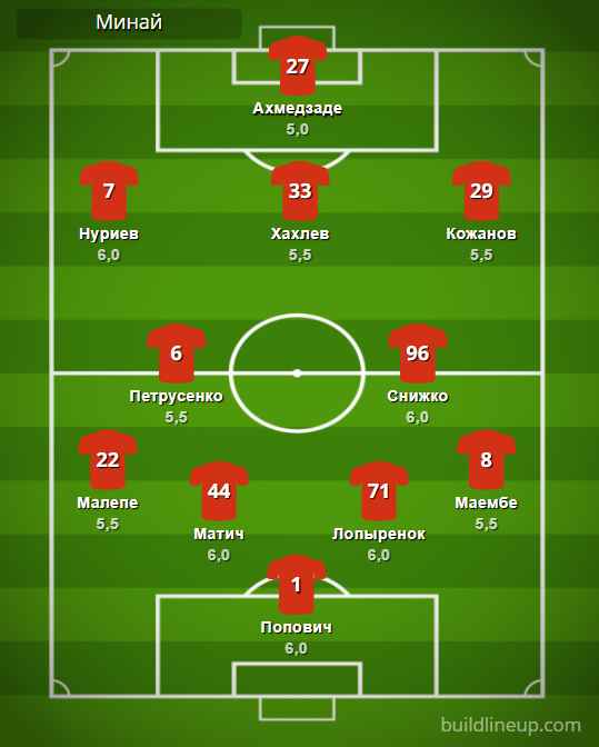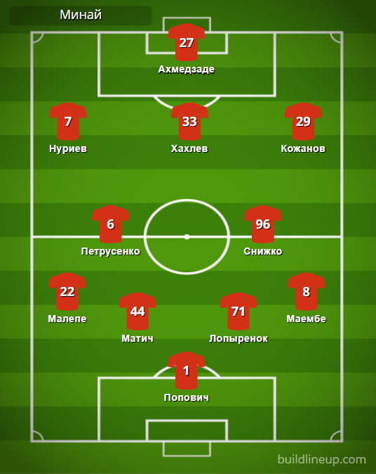 «Минай»: Попович – Малепе, Матич, Лопыренок, Маембе – Петрусенко, Снижко (Ткачук, 90+2) – Нуриев, Хахлев (Бойко, 81), Кожанов (Пиняшко, 66) – Ахмедзаде (Шиндер, 66).