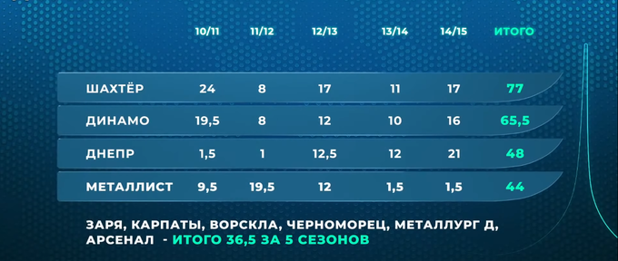 За первые пять лет «Шахтер» набрал 77 очков, «Динамо» набрало 65,5, «Днепр» – 48 и «Металлист» – 44. Остальные украинские команды набрали 36,5 очков за 5 сезонов.