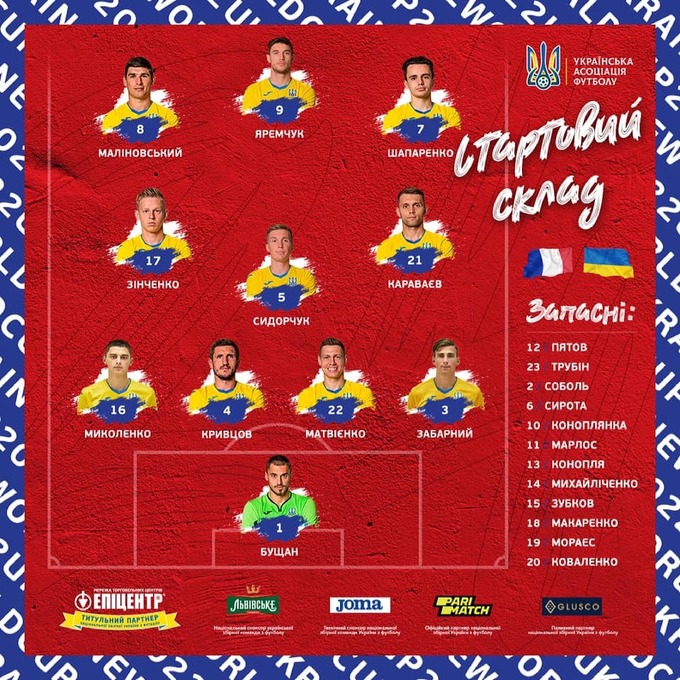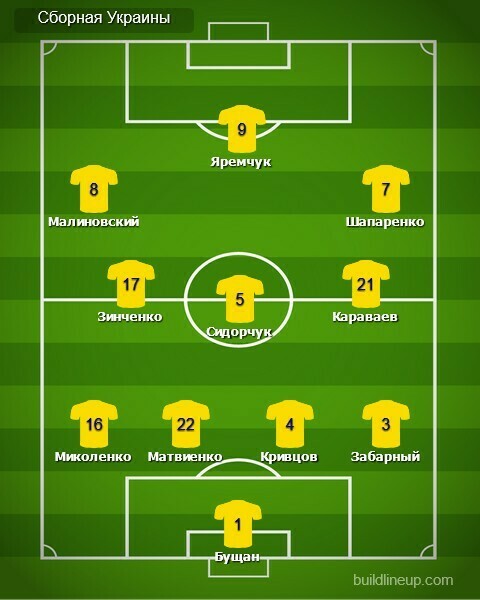 Украина: Бущан, Караваев, Забарный, Матвиенко, Кривцов, Миколенко, Зинченко, Сидорчук (Коваленко, 79), Малиновский, Шапаренко (Зубков, 86), Яремчук (Мораес, 73)