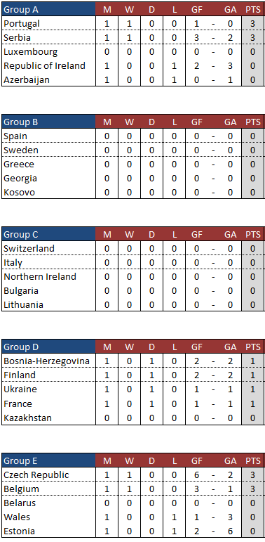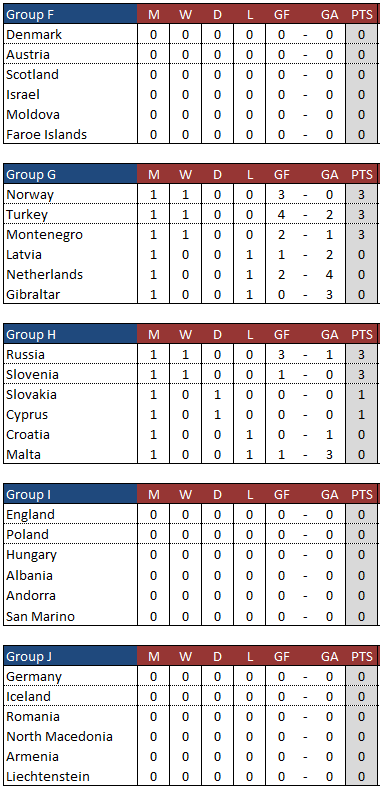 В Европе в пяти группах прошли матчи 1-го тура квалификации ЧМ-2022. Ниже приведены результаты игрового дня.