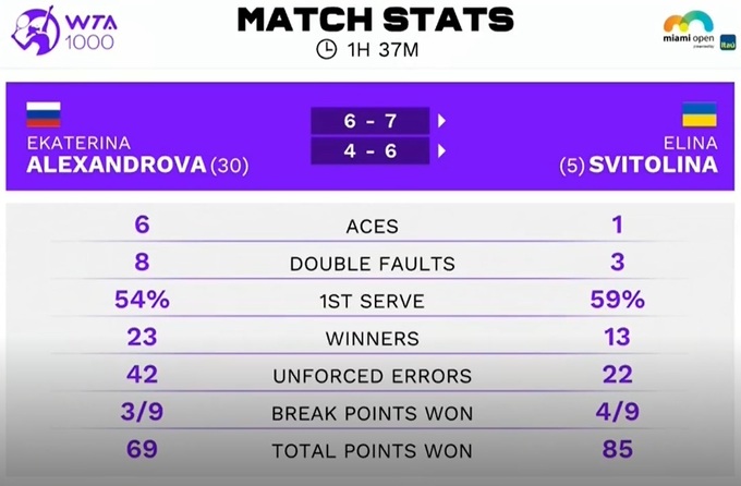 Второй сет оказался немного легче для Свитолиной из-за того, что ее соперница стала нервничать все больше. А Элина продолжала сражаться, собирая много невынужденных ошибок россиянки. Александрова часто спешила и никак не могла поймать свой ритм.