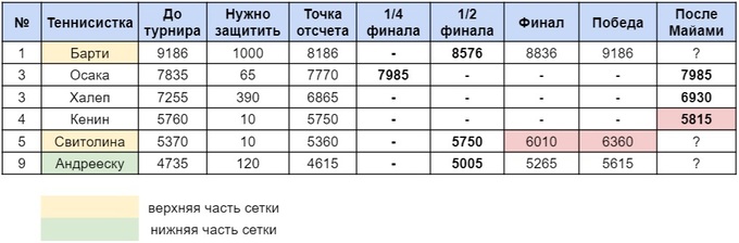 На данный момент осталась только одна важная интрига, сможет ли Свитолина обойти Софию Кенин и подняться на четвертое место. Для этого нужен выход в финал. Барти после вылета Наоми Осаки сохранит первую строчку как минимум до завершения соревнований в Мадриде. Что касается Чемпионской гонки, то Свитолина уже очень близка к топ-8, выход в финал может поднять ее в топ-5.