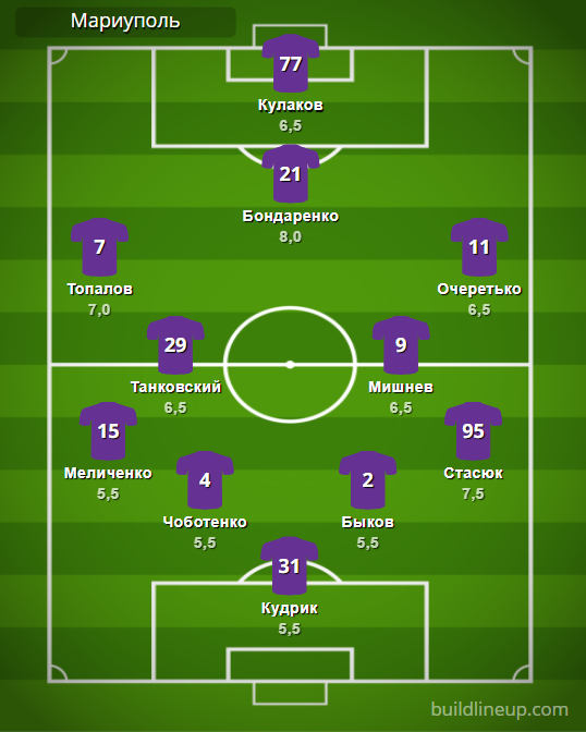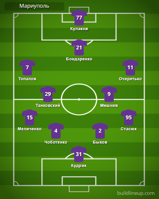 «Мариуполь»: Кудрик – Меличенко (Кирюханцев, 46), Чоботенко, Быков, Стасюк (Драмбаев, 85) – Топалов, Танковский (Сагуткин, 85), Мишнев, Очеретько (Кащук, 73) – Бондаренко (Чех, 68) – Кулаков.