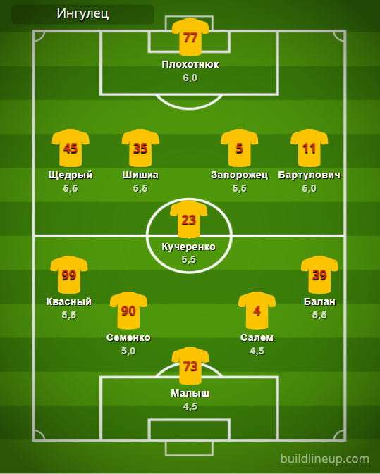 «Ингулец» (замены): Коваленко – 7,0, Козак – 7,0, Чайковский – 6,0, Шевцов – 6,0.