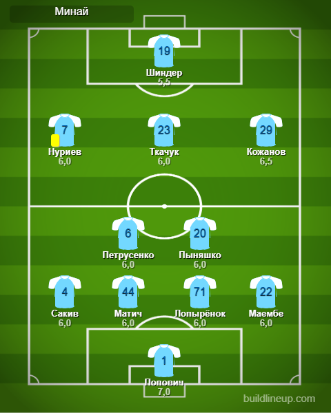 «Минай»: Попович – Сакив, Матич, Лопырёнок, Маембе – Петрусенко, Пыняшко (Милевский, 81) – Нуриев, Ткачук, Кожанов (Ахмедзаде, 88) – Шиндер (Угочукву, 81).