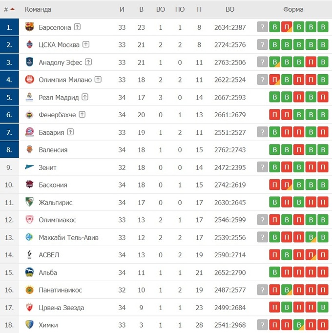 В рамках 34-го тура баскетбольной Евролиги состоялось пять матчей. «Реал» разобрался с «Фенербахче» и обеспечил себе место в плей-офф.