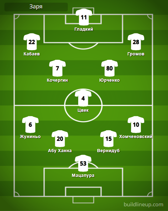 «Заря»: Мацапура – Жуниньо (Цыганикс, 82), Абу Ханна, Вернидуб (Назарина, 70), Хомченовский – Кочергин, Цвек, Юрченко – Кабаев (Лунев, 70), Гладкий (Гринь, 90), Громов (Алефиренко, 90).