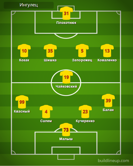 «Ингулец»: Малыш – Квасный, Салем, Кучеренко, Балан – Чайковский – Козак (Янаков, 78), Шишка, Запорожец (Щедрый, 70), Коваленко (Ситчинава, 70) – Плохотнюк (Шевцов, 70).