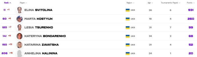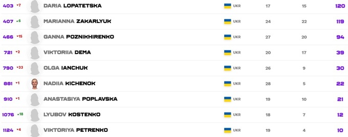 Что касается украинок, то большинство теряло позиции, или осталось при своих. По несколько позиций добавили Катерина Бондаренко, Марианна Закарлюк и Любовь Костенко.