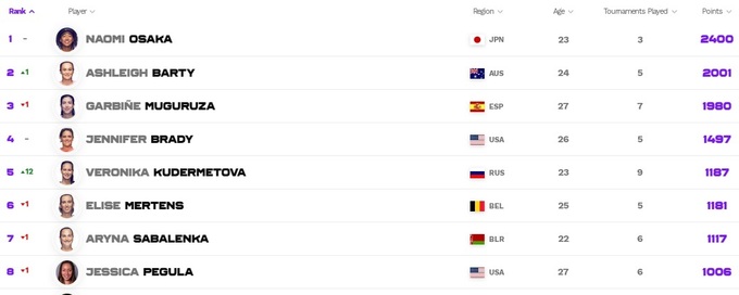 В Чемпионской гонке Кудерметова пробилась в топ-8, Элина Свитолина потеряла одну позицию и теперь 11-я. В первой тройке Эшли Барти поменялась местами с Гарбинье Мугурусой, Наоми Осака продолжает лидировать.