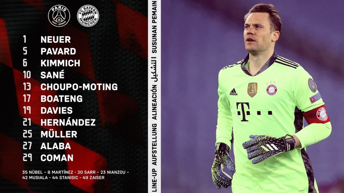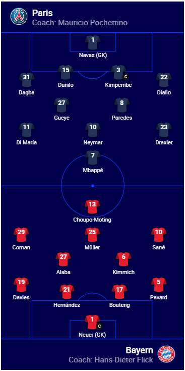 «Бавария»: Нойер, Павар, Боатенг, Эрнандес, Дэвис, Киммих, Алаба, Сане, Мюллер, Коман, Шупо-Мотинг.
