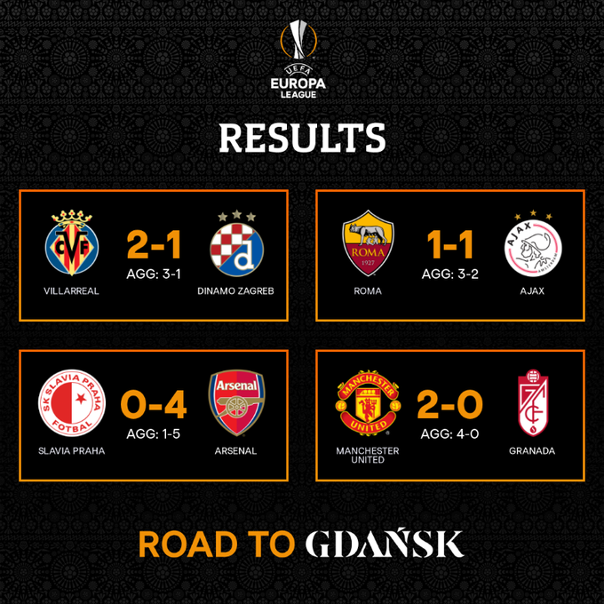 В полуфиналах играют: Вильярреал (Испания) – Арсенал (Англия), Манчестер Юнайтед (Англия) – Рома (Италия).