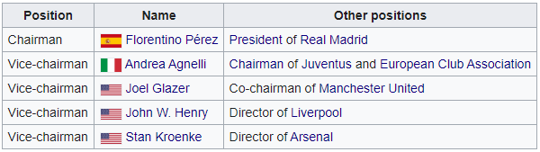 Совладелец «Манчестер Юнайтед» Джоэл Глейзер станет вице-президентом Суперлиги. Он сказал: «Собрав вместе величайшие клубы и игроков мира для игры друг с другом на протяжении всего сезона, Суперлига откроет новую главу в европейском футболе, обеспечив соревнования и условия мирового класса, а также увеличив финансовую поддержку широкой футбольной пирамиды».