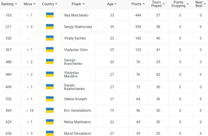 Что касается украинцев, то Илья Марченко добавил одну строчку, Сергей Стаховский – опустился на три. Существенный рывок с низов совершил Илья Белобородько (965-я позиция, +201 за неделю), которому дошли очки за финал 15-тысячника ITF. Немного добавил Эрик Ваншельбойм, он поднимется еще, получив очки за победу на турнире в Шымкенте. Также с низов рейтинга поднимается Александр Брайнин (1241, +727).