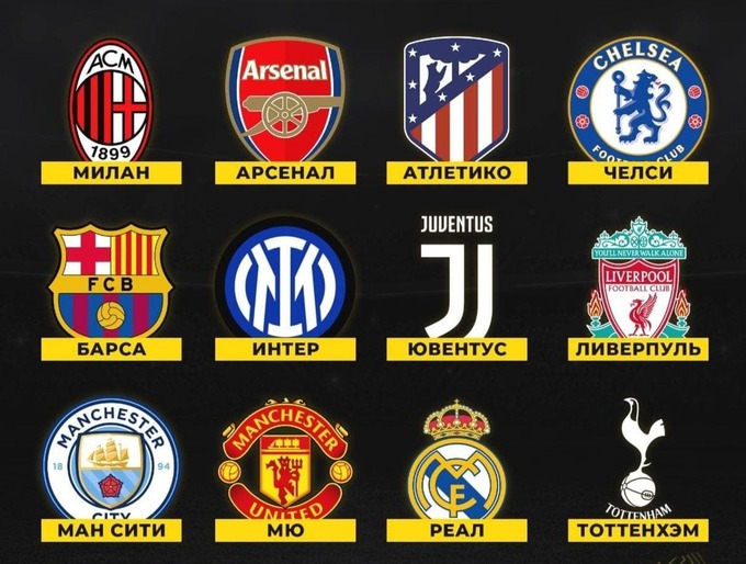 На данный момент это двенадцать клубов из Англии, Испании и Италии. Конкретно: «Манчестер Юнайтед», «Манчестер Сити», «Ливерпуль», «Челси», «Арсенал», «Тоттенхэм», «Реал», «Барселона», «Атлетико», «Ювентус», «Интер» и «Милан».