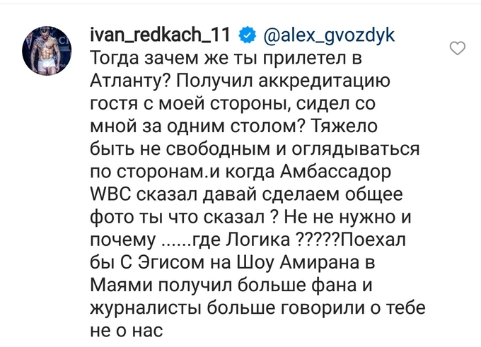 А за билеты не переживай, это даже и не билеты, а аккредитация, где у тебя была возможность расширить свой networking в бизнесе, боксе, да и просто для общего развития, но увы, твоя «субординация» тебя ограничила даже в такой возможности», - написал Редкач.