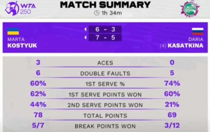 Марта Костюк (Украина) – Дарья Касаткина (Россия) – 6:3, 7:5