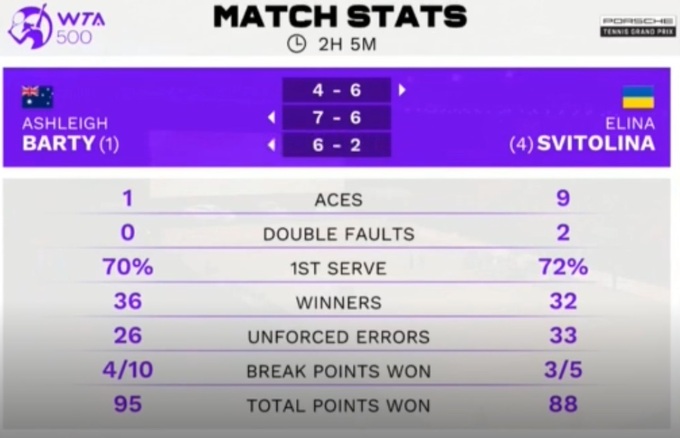 Судьба третьего сета решилась в третьем гейме. Элина отыграла тройной брейкпоинт, но в борьбе на больше-меньше все же уступила. До конца матча австралийка не давала шансов украинке на брейкпоинты, а в седьмом оформила еще один брейк.