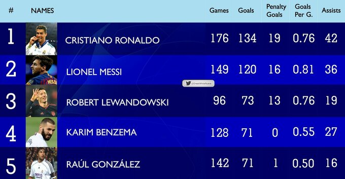 Больше в Лиге чемпионов забивали только Криштиану Роналду (134), Лионель Месси (120) и Роберт Левандовски (73).
