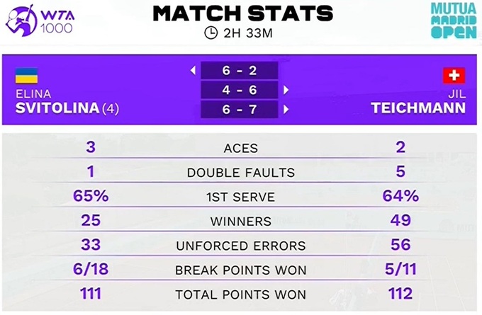Первая ракетка Украины Элина Свитолина (№5 WTA) проиграла стартовый матч основной сетки на турнире WTA 1000 в Мадриде.