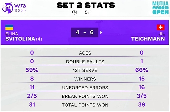 Второй сет должен был стать продолжением избиения Тайхман, Элина даже выиграла два первых гейма. Но, внезапно, украинка посыпалась, потеряв психологическую уверенность в своих силах. Швейцарка поднажала и выиграла пять геймов из шести. И только после этого Элина вернулась с небес на землю и начала оказывать сопернице какое-то сопротивление. В девятом гейме был отыгран сетбол, а в десятом она имела шансы, чтобы сравнять счет. К сожалению, не получилось, пришлось отложить решение данного дела на финальную партию.