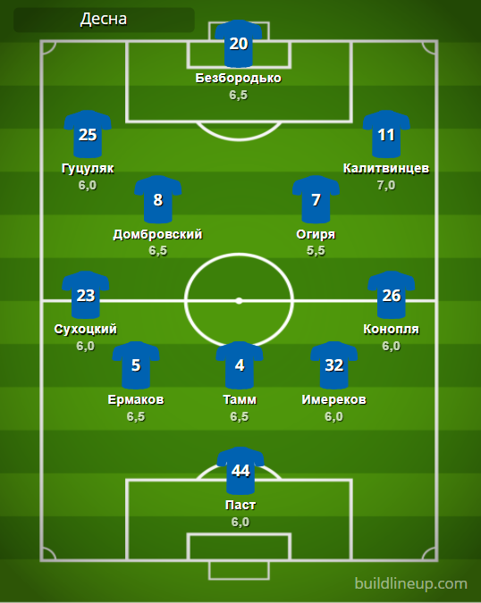 «Десна»: Паст – Сухоцкий (Мостовой, 74), Ермаков, Тамм, Имереков (Гитченко, 46), Конопля – Гуцуляк (Дегтярев, 80), Домбровский (Картушов, 46), Огиря, Калитвинцев – Безбородько.