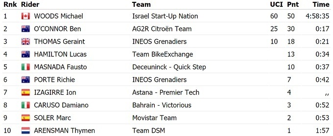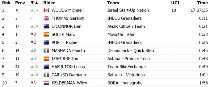 Канадский гонщик команды «Israel Start-up nation» Майкл Вудс выиграл ключевой горный этап Тура Романдии и перехватил лидерство в общем зачете. На финиш он приехал вместе с Герэйнтом Томасом, однако британец упал за 15 метров до финиша.