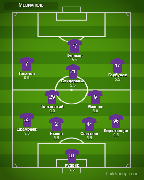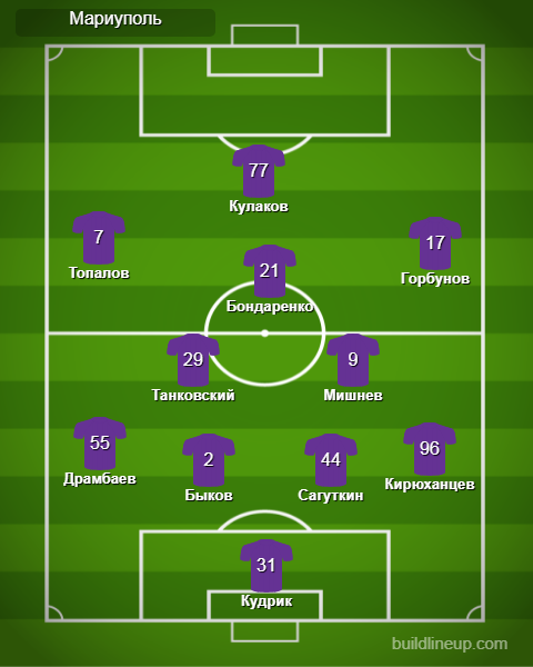 «Мариуполь»: Кудрик, Драмбаев (Стасюк, 46), Быков (Мампасси, 75), Сагуткин, Кирюханцев, Мишнев, Танковский (Чех, 55), Топалов, Горбунов (Очеретько, 46), Бондаренко (Меличенко, 73), Кулаков
