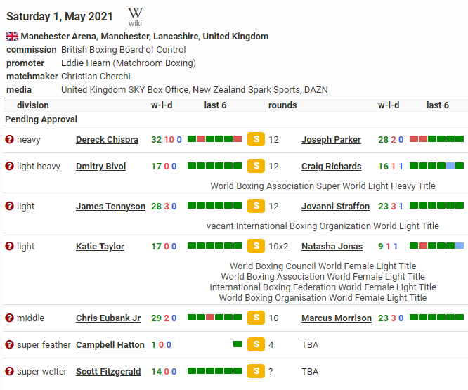 В конце октября Чисора проиграл решением судей украинцу Александру Усику. Паркер в феврале нокаутировал Джуниора Фа из Новой Зеландии.