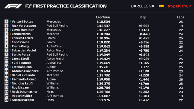 Сегодня в Барселоне в первой практике лучшим был Валттери Боттас, который опередил Макса Ферстаппена на 0,033 секунды. Топ-3 замкнул Льюис Хэмилтон с отставанием в 0,1 секунду.