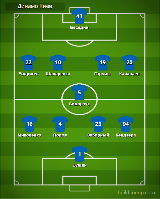 «Динамо» Киев: Бущан – Миколенко, Попов, Забарный, Кендзера – Сидорчук – Родригес (Сидклей, 72), Шапаренко (Дуэлунд, 81), Гармаш (Леднев, 72), Караваев (Цыганков, 59) – Беседин (Ванат, 81).