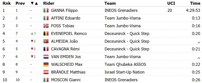 Лидерство в общем зачете сохранил победитель первого этапа Филиппо Ганна из «Ineos Grenadiers».