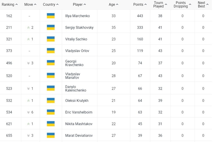 Что касается украинцев, то особых изменений ни у кого не случилось. Отметим, что Сергей Стаховский добавил две строчки, а Виталий Сачко – одну. Илья Марченко сохранил свою позицию.