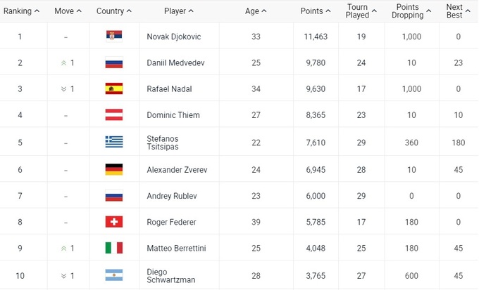 После завершения Мастерса в Мадриде в первой десятке мирового рейтинга случилось несколько изменений. Рафаэль Надаль снова потерял третью строчку, пустив вперед россиянина Даниила Медведева. Финалист соревнований Маттео Берреттини опередил Диего Шварцмана и теперь девятый.