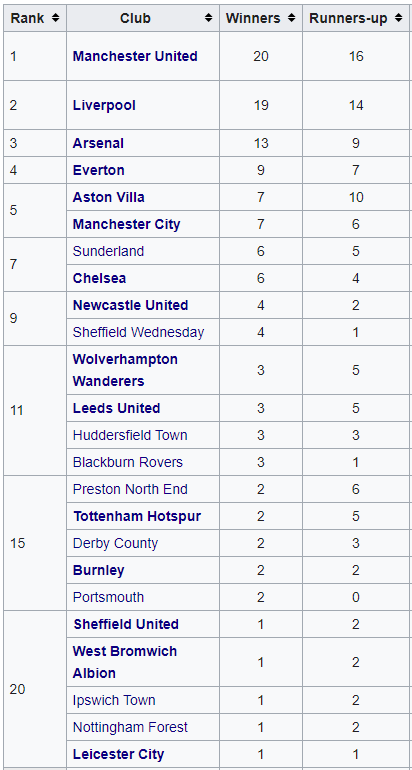 Жирным шрифтом выделены команды, которые ныне выступают в АПЛ.