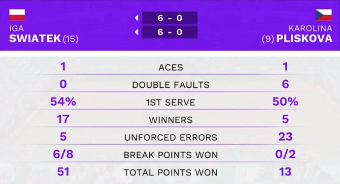 Ига Свёнтек (Польша) – Каролина Плишкова (Чехия) – 6:0, 6:0